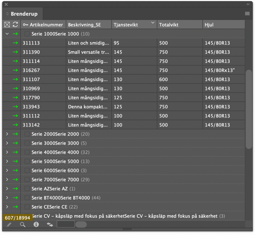 Med hjälp av EasyCatalog och InDesign kan du producera kataloger, prislistor, annonser och annat material mycket effektivt. Ägna tiden åt kreativt arbete och låt EasyCatalog hantera alla texter, bilder och priser på dina produkter. Exemplet visar EasyCatalog’s produktpanel i InDesign. Härifrån styrs alla mallar och berikning av dokumentet.